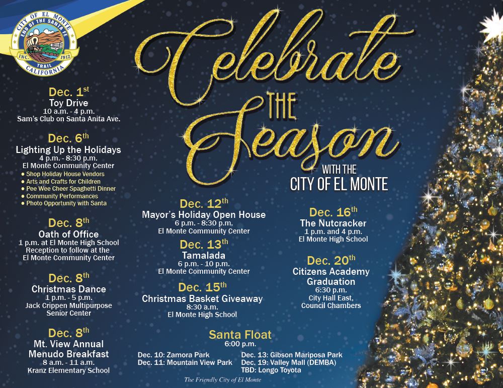 ‘Tis the season to be jolly! The City of El Monte invites all community members to celebrate the holiday season with free to low-cost activities that create wonderful memories, bring families together and strengthen the relationship between our staff and the community.